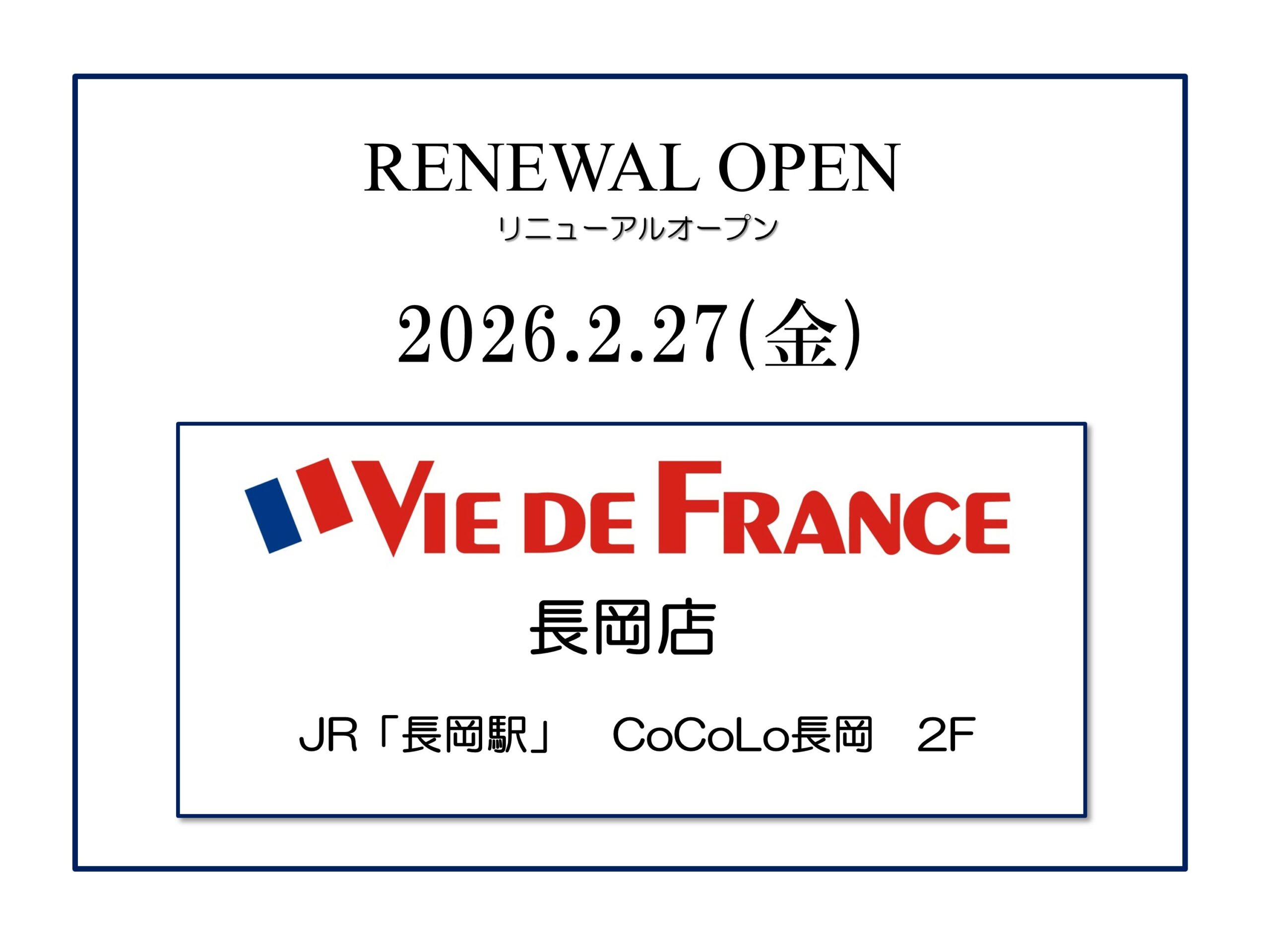 この度ヴィ・ド・フランス長岡店は、2/27(金)にリニューアルオープンいたします。