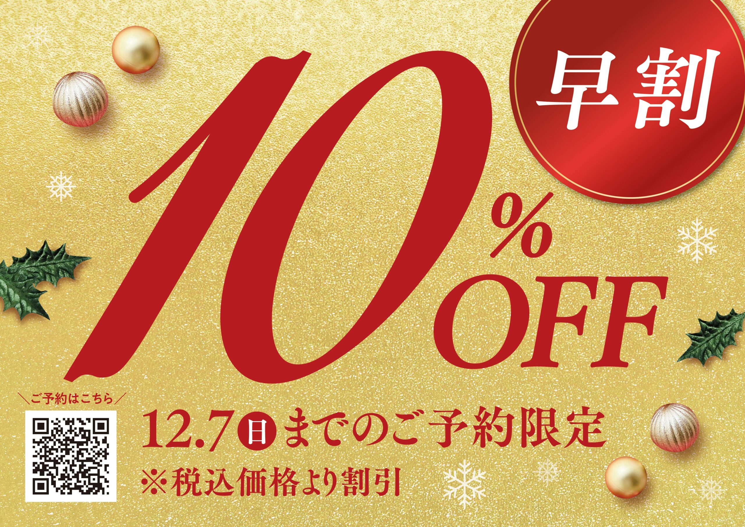今年も12/7(日)までにご予約いただくと10%OFFになる早割予約特典付き!