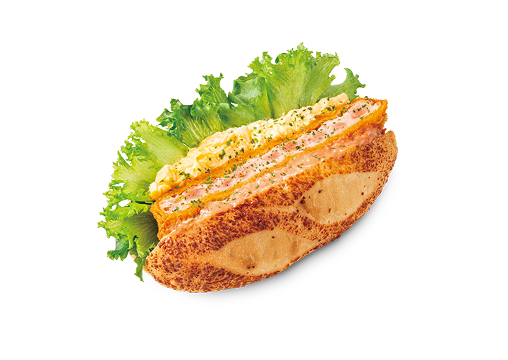 ぷりぷり食感の海老カツとタマゴサラダを挟み、オーロラソースで味付け。
