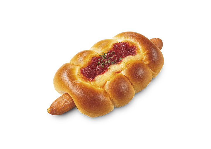 スモーキーで食べ応えのあるデンマークウインナーにソフトな生地を巻き、つぶ野菜入りのケチャップをトッピング